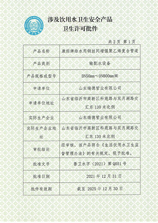 瑞德PVC-U涉水许可批件